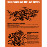 CHUM is a pamphlet adventure for the DIVE system, where PCs will find themselves stranded on a small island town during a massive storm and besieged by radioactive mutated sea creatures. As the water level rises, characters will be forced to find shelter in increasingly dangerous locations, like the marina, the derelict fishery, and the Drill Corp. Chemical Laboratory itself.